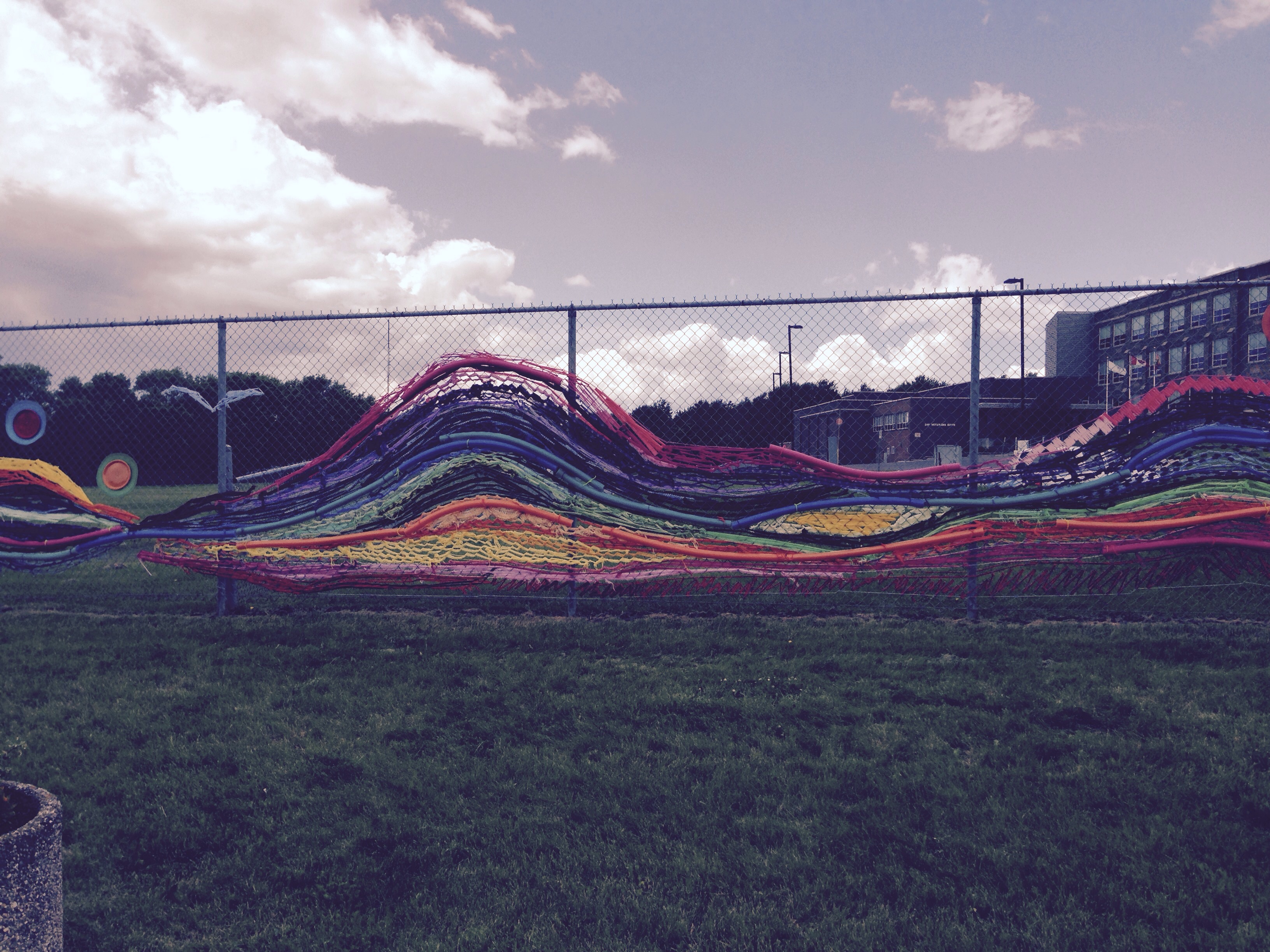 It is only two weeks until the Habitat for Humanity Cycle of Hope. Every chance I get, I am out on my bike, especially at the lake where the hills provide a great training ground for the hills of Michigan and Wisconsin. Saturday, we ride 65 kilometres in and around Kenora. At one point, I pass the local high school where a group of kids are doing something with the chain link fence that surrounds the school yard. Are they decorating it for grad, I wonder. I can’t tell, really. There are some brightly coloured threads being woven into the fence. I am intrigued to know what it is.